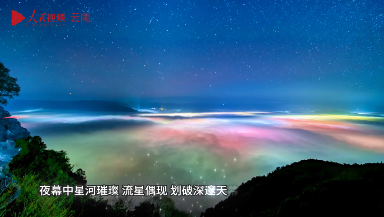 Неповторимый пейзаж ночного звездного неба и моря облаков в лучах восходящего солнца