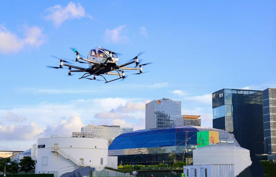 23 июля 2025 года, полет электрического летательного аппарата с возможностью вертикального взлета и посадки /eVTOL/ компании Guangzhou EHang Intelligent Technology над городом Шанхай /Восточный Китай/ во время проведения Международной выставки низковысотной экономики-2025.…