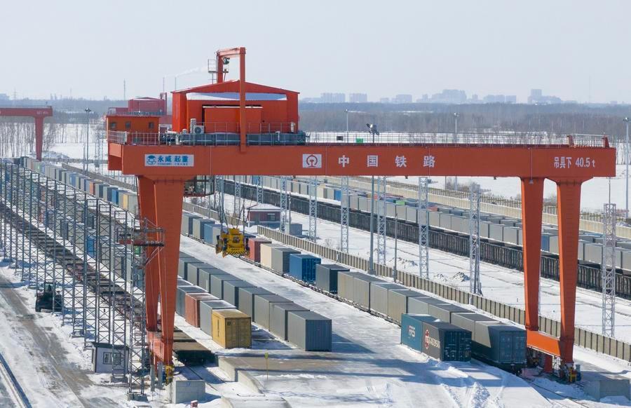 25 февраля 2026 года, контейнеры, перевозимые грузовыми поездами Китай-Европа, на перевалочной базе Северной ж/д станции Тунцзяна /пров.…