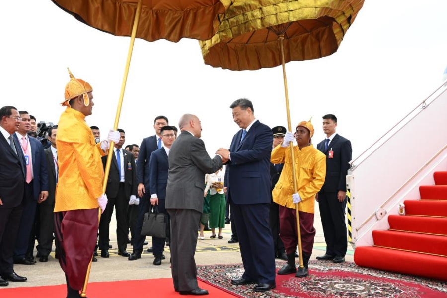 Си Цзиньпин был тепло встречен королем Камбоджи Нородомом Сиамони, председателем Народной партии Камбоджи и Сената /верхняя палата парламента/ страны Хун Сеном и другими высокопоставленными чиновниками в аэропорту на торжественной церемонии приветствия, проведенной королем.