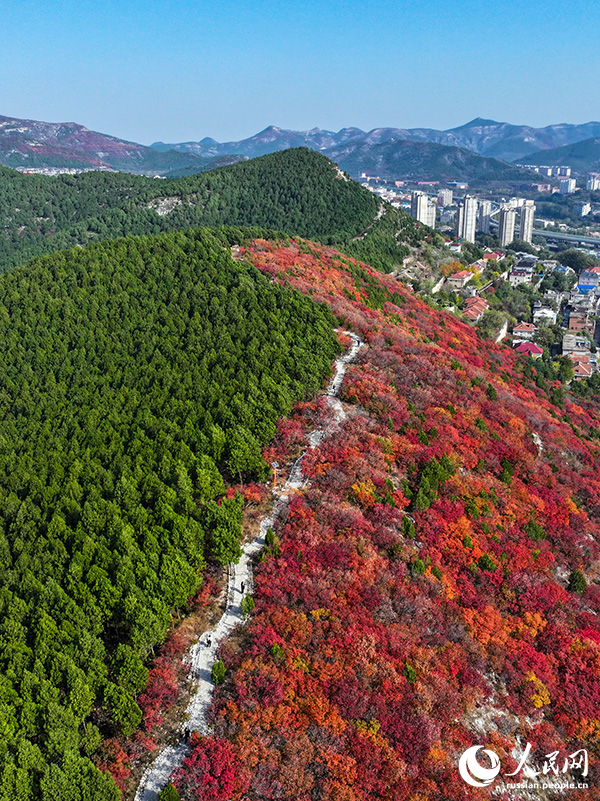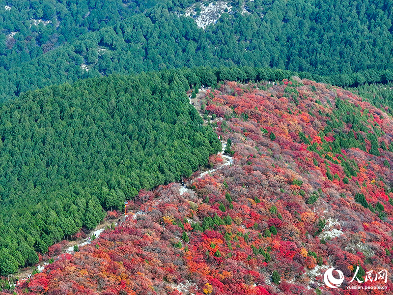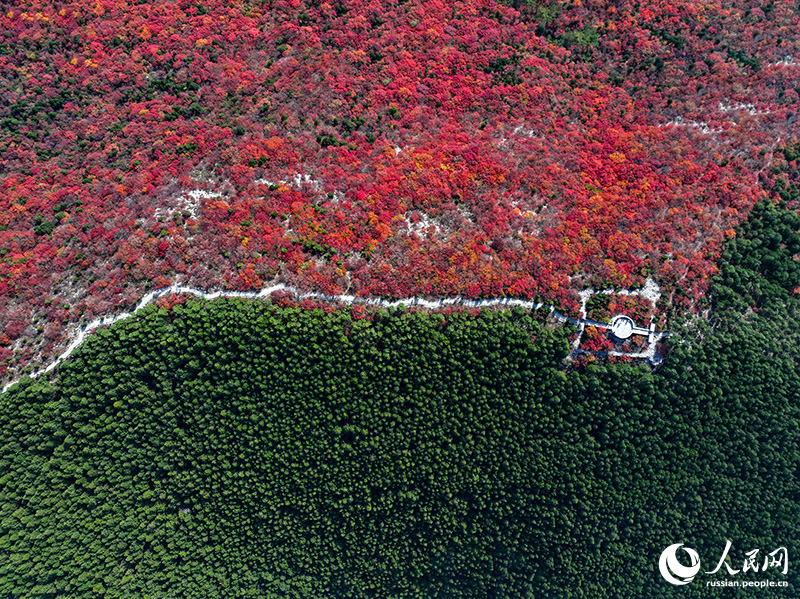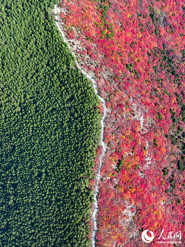 3 ноября, «Жэньминь жибао» онлайн -- В разгар осени гора Сецзышань в городе Цзинань /провинция Шаньдун, Восточный Китай/ удивляет туристов контрастным пейзажем. Горный хребет делит Сецзышань на два склона: северный покрыт вечнозелеными соснами и кипарисами, а южный – зарослями скумпии кожевенной, листья которой осенью становятся насыщенно-красными. Этот контраст создает впечатляющую картину, когда одна гора словно раскрашена в два разных цвета.