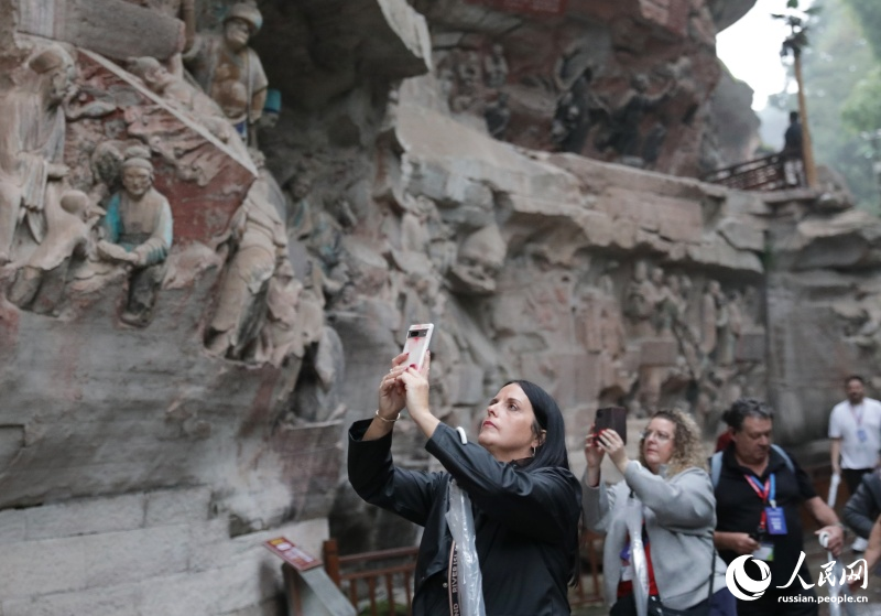 7 ноября, «Жэньминь жибао» онлайн -- На днях иностранные туристы посетили парк наскальных рельефов Дацзу, где осмотрели изящные каменные статуи.