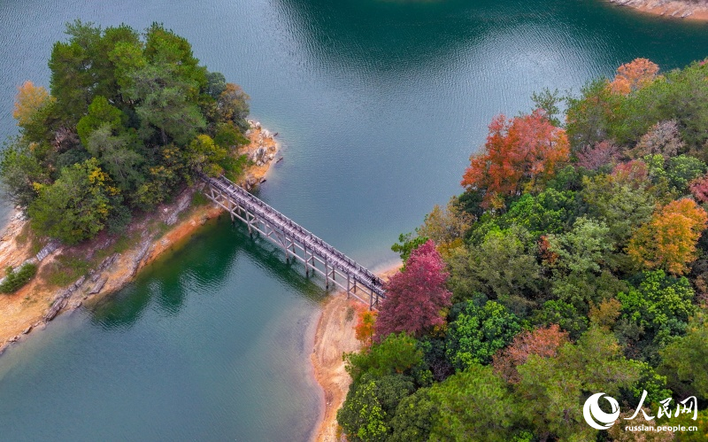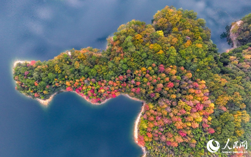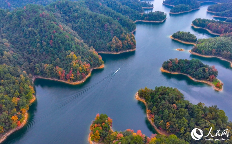 12 ноября, «Жэньминь жибао» онлайн -- На днях в уезде Чуньань города Ханчжоу провинции Чжэцзян острова разных форм и размеров в заливе Хунъевань (залив Красных листьев) озера Цяньдаоху (озера Тысячи островов) покрылись яркими осенними красками, создав живописную картину.