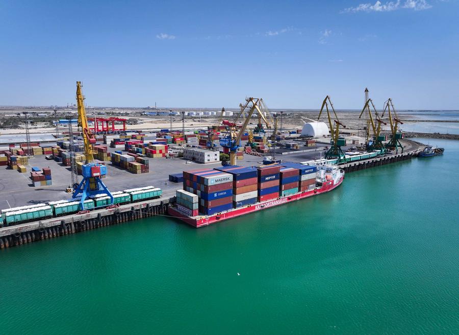 6 августа 2025 года, грузовое судно пришвартовывается к причалу грузового терминала порта Актау в Казахстане, который является важным узлом на Транскаспийском международном транспортном маршруте /ТМТМ/. /Фото: Синьхуа/