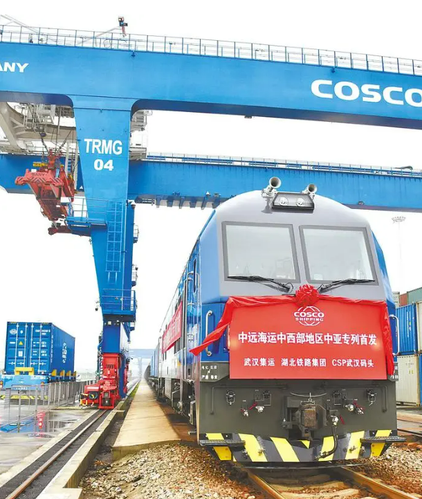 Контейнерный поезд, осуществляющий интермодальную железнодорожно-водную перевозку, отправился из Уханя в Центральную Азию
