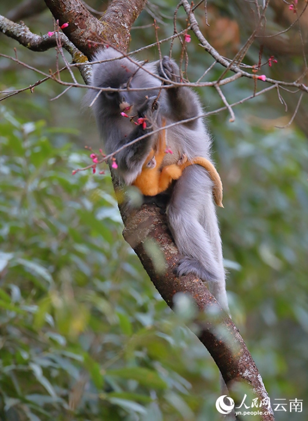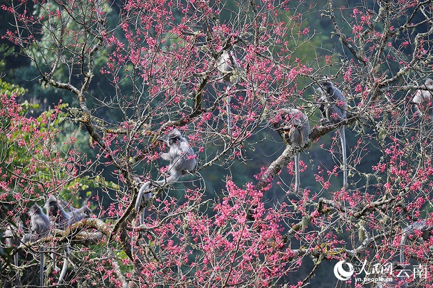 15 января, «Жэньминь жибао» онлайн -- В национальном природном заповеднике Уляншань провинции Юньнань /Юго-Западный Китай/ была запечатлена уникальная сцена: более ста индокитайских серых лангуров /Trachypithecus crepusculus/ лакомились цветами сакуры. Об этом сообщает сайт «Хуаньцюван».