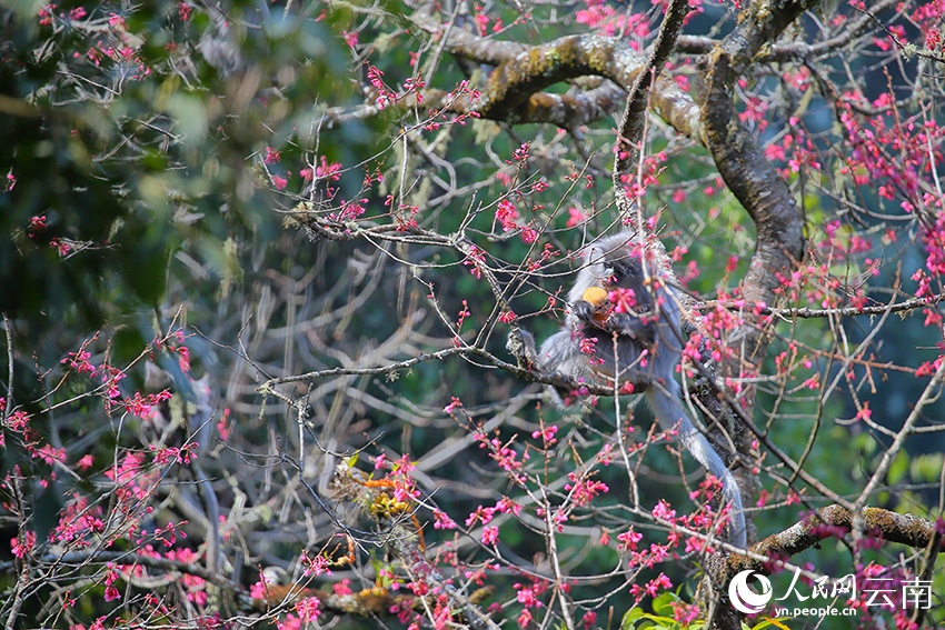 В Юньнани редкие лангуры устроили пир на цветущей сакуре