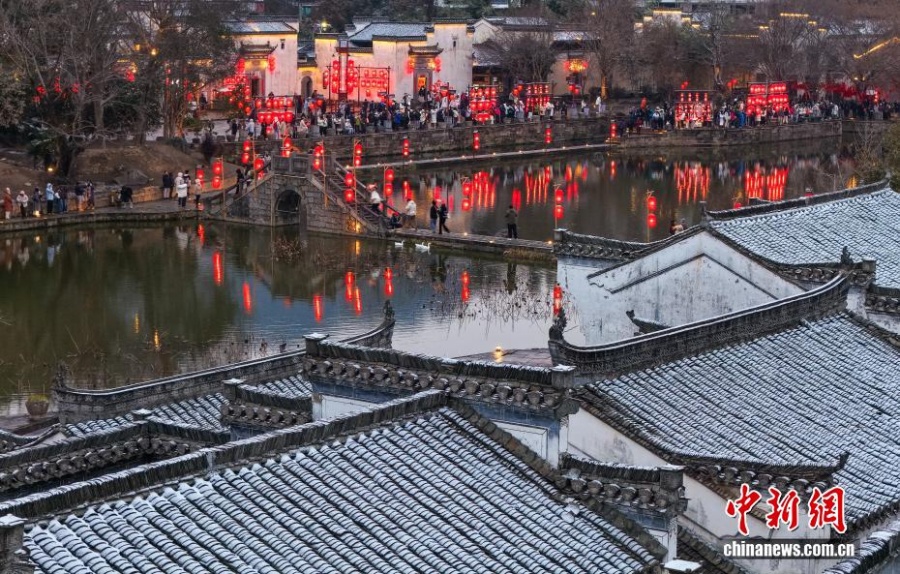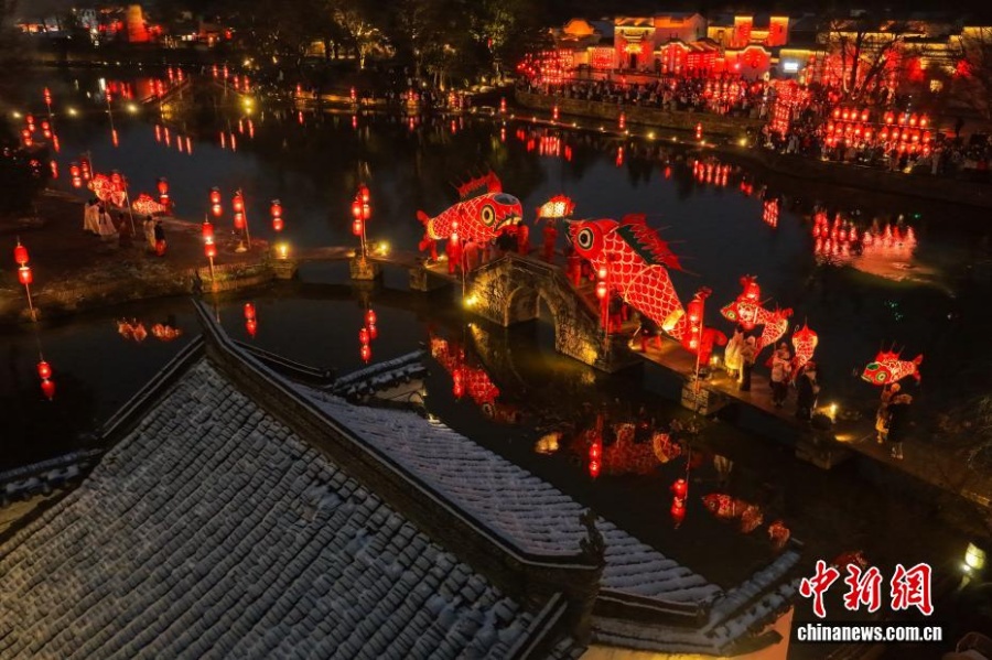 22 января, «Жэньминь жибао» онлайн -- 20 января в древней деревне Чэнкань в городе Хуаншань провинции Аньхой выпал снег. Белые дома укрылись легким серебристым покровом, а по улицам «проплыло» яркое шествие с фонарями-рыбами, окутав древнее поселение аурой романтики и таинства.-0-