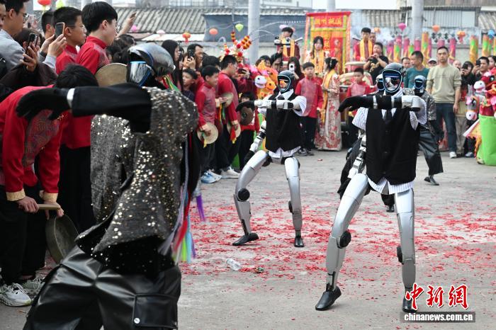 25 февраля, «Жэньминь жибао» онлайн -- 24 февраля в деревне Тяньтоухэ города Чаочжоу провинции Гуандун состоялось народное шествие. Роботы танцевали под традиционную музыку вместе с исполнителями танца «бумаву» – народного танца с более чем 700-летней историей. Необычное представление привлекло внимание местных жителей, которые с восхищением наблюдали за гармоничным тандемом человека и машины.-0-