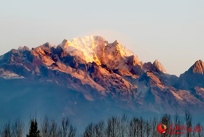 Снежная гора Юйлун в солнечных лучах отливает золотом