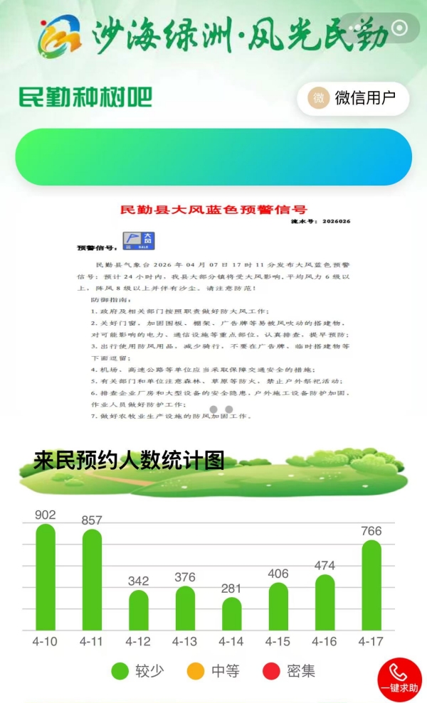 5 февраля Центр общественного развития лесонасаждений уезда Миньцинь открыл онлайн-регистрацию через мини-приложение WeChat. К 24 марта число зарегистрировавшихся онлайн превысило 33 тысячи. Как сообщила секретарь уездного комитета Комсомола Чжан Ялань, акция продлится примерно до 10 мая. За это время планируется закрепить пески на площади более 133 гектаров и высадить свыше 800 тысяч пустынных растений.