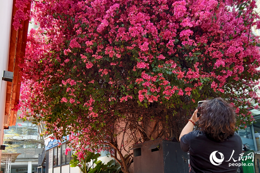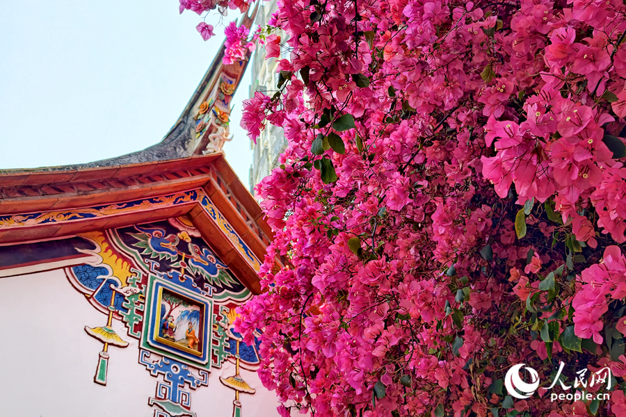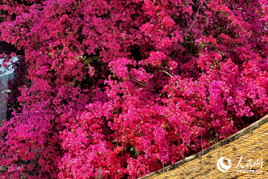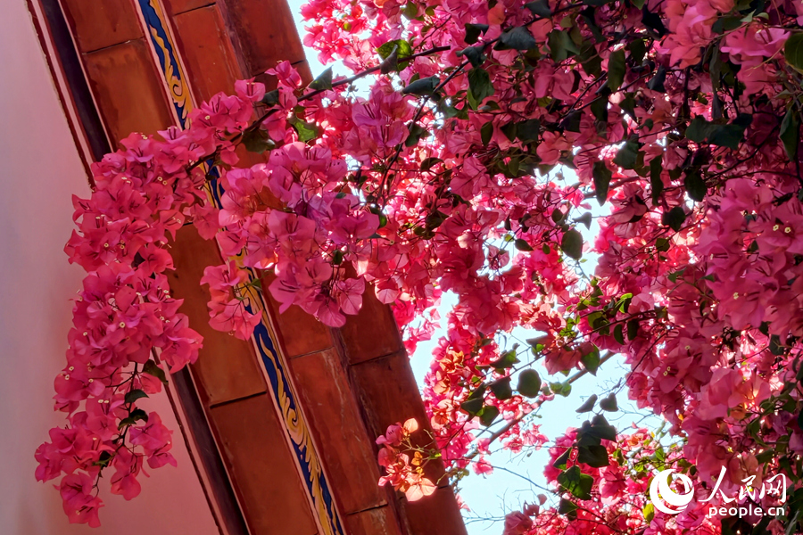 13 апреля, «Жэньминь жибао» онлайн -- В конце весны в старинном квартале Сяндянь города Сямэнь провинции Фуцзянь «городской цветок» — бугенвиллея — пышно расцветает под тёплым ветром. Волны пурпурно-красных цветов разливаются по карнизам и террасам старинных домов, привлекая прохожих, которые останавливаются, чтобы насладиться этим романтическим сочетанием древнего очарования и ярких цветов.-0-